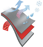 WINDSTOPPER™ メンブレンは生地のアウターレイヤーとインナーレイヤーとの間にラミネート(貼り合わせ)された極薄の保護レイヤーで完全な防風性能を備えています。PTFE(ポリテトラフルオロエチレン)で出来たこの素材には気体になった水の粒子より900倍大きな孔が無数にあり、防風性能の他に通気性も兼ね備えているのが特徴です。