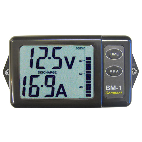 縦 62mm × 横 125mm × 厚さ 23mm のコンパクトなバッテリーモニターです。BM-1&2コンパクトは、好評のBM-1&2バッテリーモニターのダウンサイジング品です。一体型ケースであらゆるキャンピングカーや小型ボート・ヨットなどに簡単に取り付けできます。ユニットは継続的に電圧、電流(充電または放電)を監視し、バッテリーを充電または放電するための残り時間を計算して表示します。この情報により、バッテリーの寿命を向上させると共に故障のリスクを減らす為の効率的な使用に役立てることができます。操作は非常に簡単です。一つ目の画面で電圧、電流(充電または放電)と残りの容量を示す棒グラフが表示されます。容量が低下している場合にはアラームとディスプレイの点滅で警告します。二つ目の画面は、アナログとデジタル両方の形式でバッテリー残量を表示するとともに、現在の充電/放電速度で利用可能な残り時間を示します。消費電力はわずか1.5mAです。